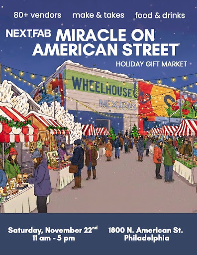 On Saturday, November 22, 2025, from 11 a.m. to 5 p.m., NextFab will open its doors to the public for their fifth annual Miracle of American Street Holiday Market! Celebrate the season with a day of festive shopping, creativity, and community as you browse unique, handmade gifts crafted by over 80 talented local makers, artists, and entrepreneurs from across the Philadelphia area. Guests can enjoy live demonstrations, hands-on activities, and exciting giveaways throughout the day. Whether it’s a one-of-a-kind holiday treasure, or simply soaking up the festive spirit, there is something special for everyone at NextFab’s holiday market.