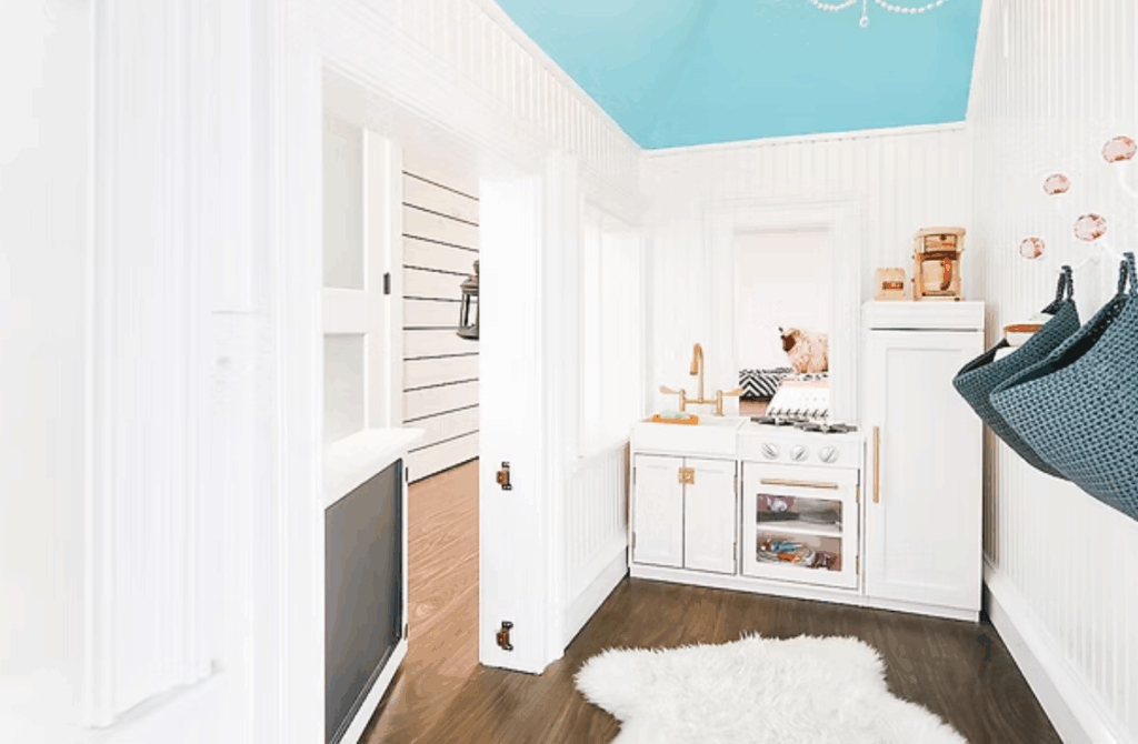 For example, maybe a dining room table can be turned in a different direction. In the newly-free space set up a small play area, a bookshelf, a play kitchen, or an easel for crafting.